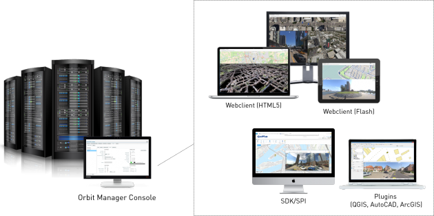 The 3DM Publisher product exists of a Server Software Installation (incl. Manager Console), a WebClient, API (orbit SDK), and available Plugins in Esri, AutoCAD Map, QGIS and Microstation.