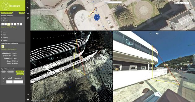 Measure, attribute and extract points, distances, poly(lines), areas, and simple volumes. Measure on any of the available views. Measure using images only, on the image but using point cloud behind, on the 3D point cloud, 2D Map, etc. Multiple results will be presented. Finally, download the results and share.