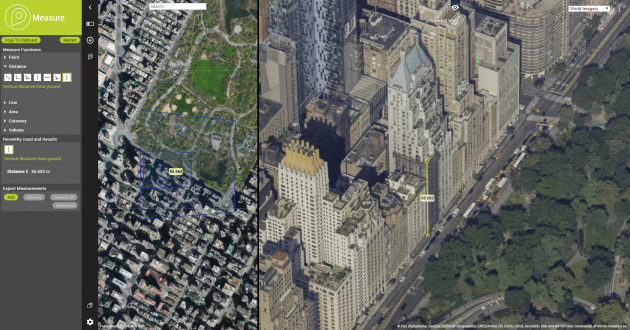 Measurements can be made using a DEM or triangulation. Single-click measurements require a DEM. With the measurement HUD, tools to measure coordinates, distances, heights, and areas are just one click away.
